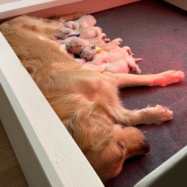 Flopsy the Golden Retriever was bred to Darby the Golden of Joys of Living Assistance Dogs. On August 1st, she welcomed this beautiful litter into the world. This is Flopsy's second litter. All of these pups have now been placed and are growing quickly!